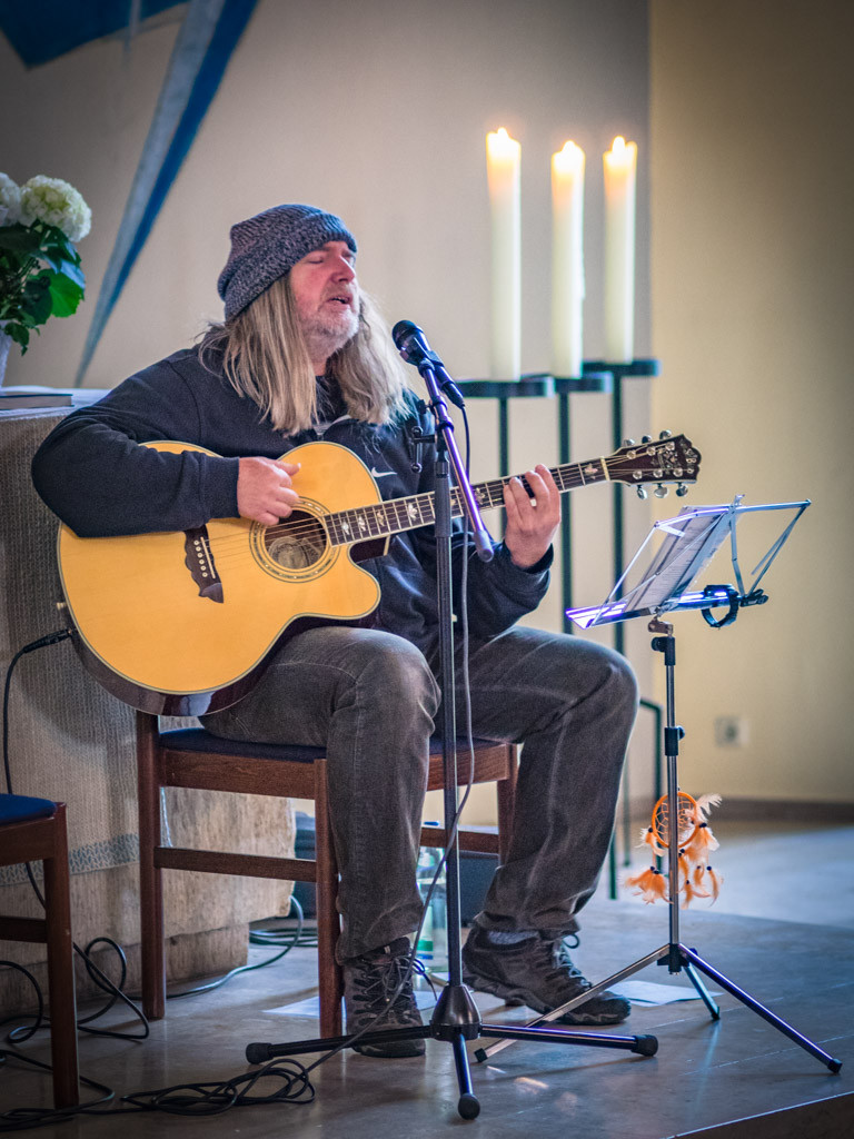 Pichi (Pichi´s Gitarrenstudio) gab am 24. April 2016 um 18 Uhr wieder ein Konzert in der Apostelkirche zugunsten des neuen Gemeindehauses: Spirituelles Singen mit Liedern aus verschiedenen Kulturen für Menschen aus verschiedenen Kulturen und mit unterschiedlicher religiöser Herkunft, auch und ganz besonders zum Mitsingen. Dieser Abend war geschenkte Zeit, um zur Ruhe zu kommen, raus aus der Hektik des Alltags, ein Weg zu sich selbst. Vor und nach dem Konzert wurden Getränke, Chili und Hopfister-Ökobrote angeboten.