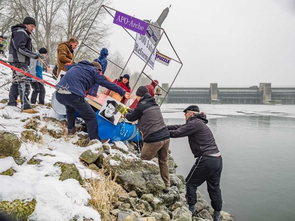 Das Team um Dirk Lay baute eine Arche, die als Mottofloss und Mutterschiff für die Schwimmer diente. Da der Kern der Besatzung Mitglieder des Posaunenchors waren, wurden auch die Instrumente mitgenommen. Gemeinsam mit einer Original-Schiffsglocke wurde so auch akustisch auf sich aufmerksam gemacht. Statt einer Schiffsschraube oder Segel verfügte die APO-Arche über einen Reformationsantrieb.