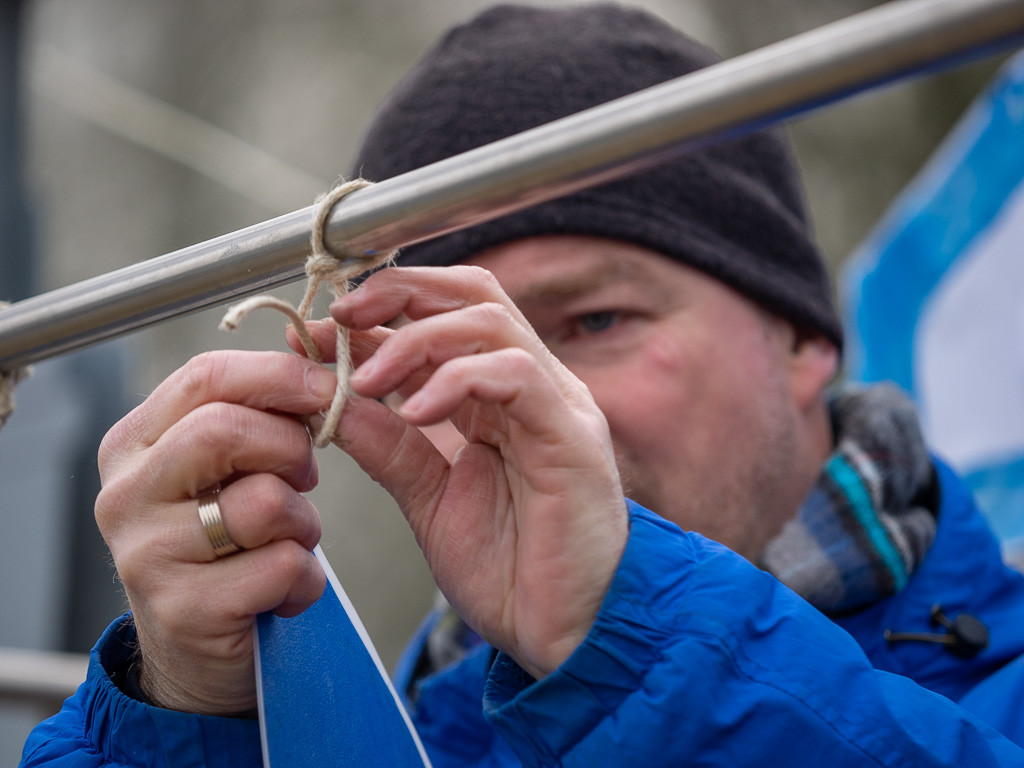 Das Thema „10 Jahre Menschenrecht auf Zugang zu sauberem Wasser“ wurde einstimmig beschlossen, passt es doch hervorragend zur Donau und entspricht unserer christlichen Wertevorstellung. Die APO-Arche wurde diesmal mit einer Autobatterie und Pumpe für einen großen Wasserhahn elektrifiziert. Die Trockenlogistik konnte am Morgen des 25. Januars das Floß nach Bittenbrunn zur Staustufe transportieren und über das steile und steinige Donauufer zu Wasser lassen. Nun fieberten wir bei einem Weißwurstfrühstück dem Start um 13 Uhr entgegen.