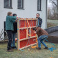 Die Plattform wird ins Freie getragenDIe Schwimmfässer werden an der Plattform befestigtDie Arche wird ohne Aufbau auf den Anhänger gebrachtVor der Abfahrt muss zunächst noch Luft in einen Reifen gepumpt werdenEndlich an der DonauNoch etwas Feinarbeit hier ...... und dortDie Arche wird am Donauufer herabgelassenDer schwierigste Moment an den UfersteinenPanoramaaufnahme vor dem StartPanoramaaufnahme nach dem StartDaniel mit seiner Medaille